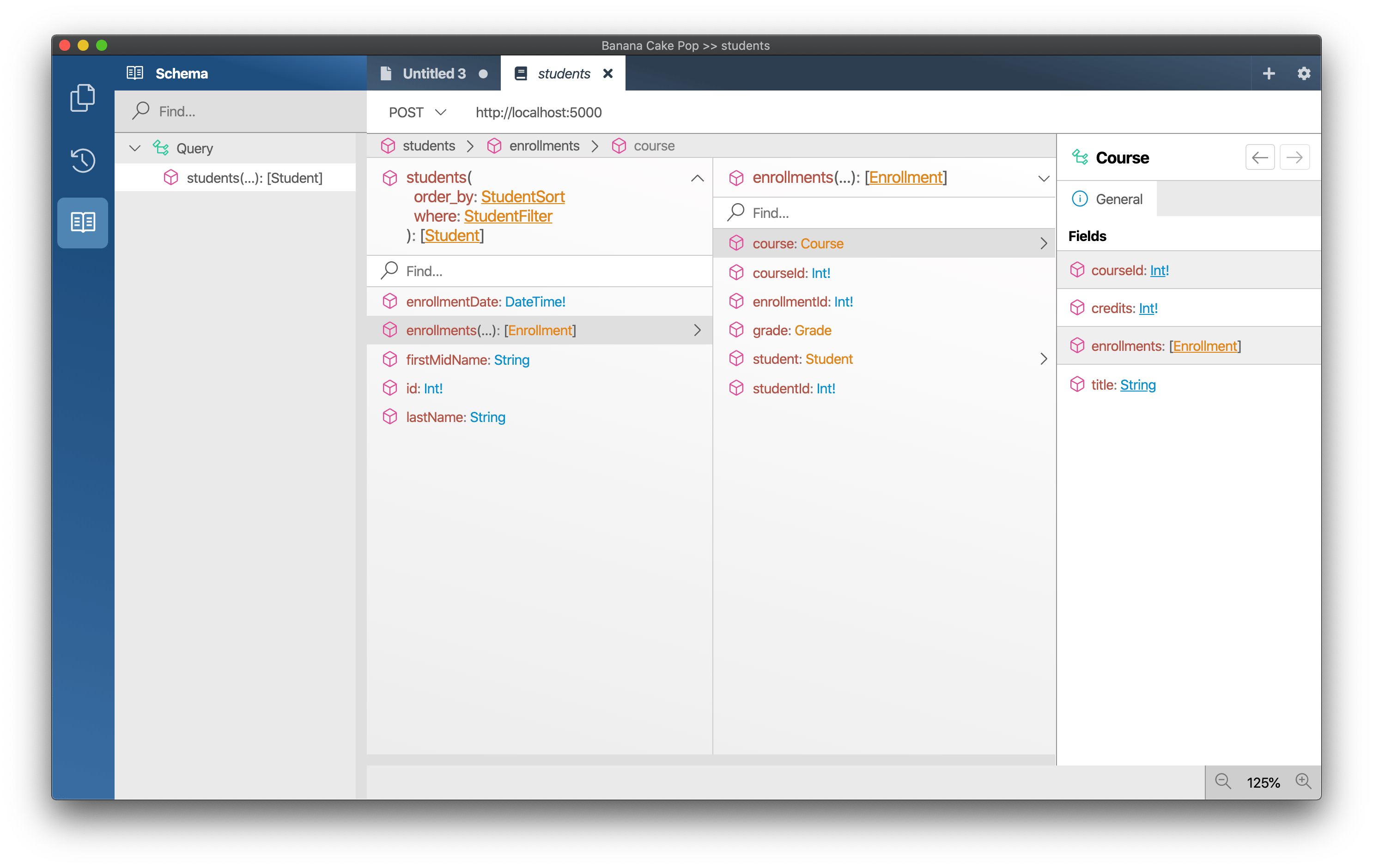 Now let us inspect our schema again. When we look at the students field we can see that there are new arguments called where and orderBy.