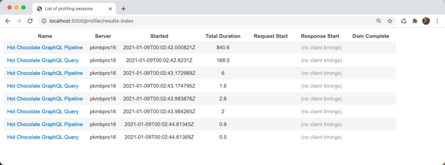 That's it! Now, when you run your app and do some GraphQL queries, you can browse to the URL http://localhost:5000/profiler/index-results and that will give you a list of all your GraphQL requests. You can drill down on any request and see both the query itself, as well as any variables passed in with the associated value and type.