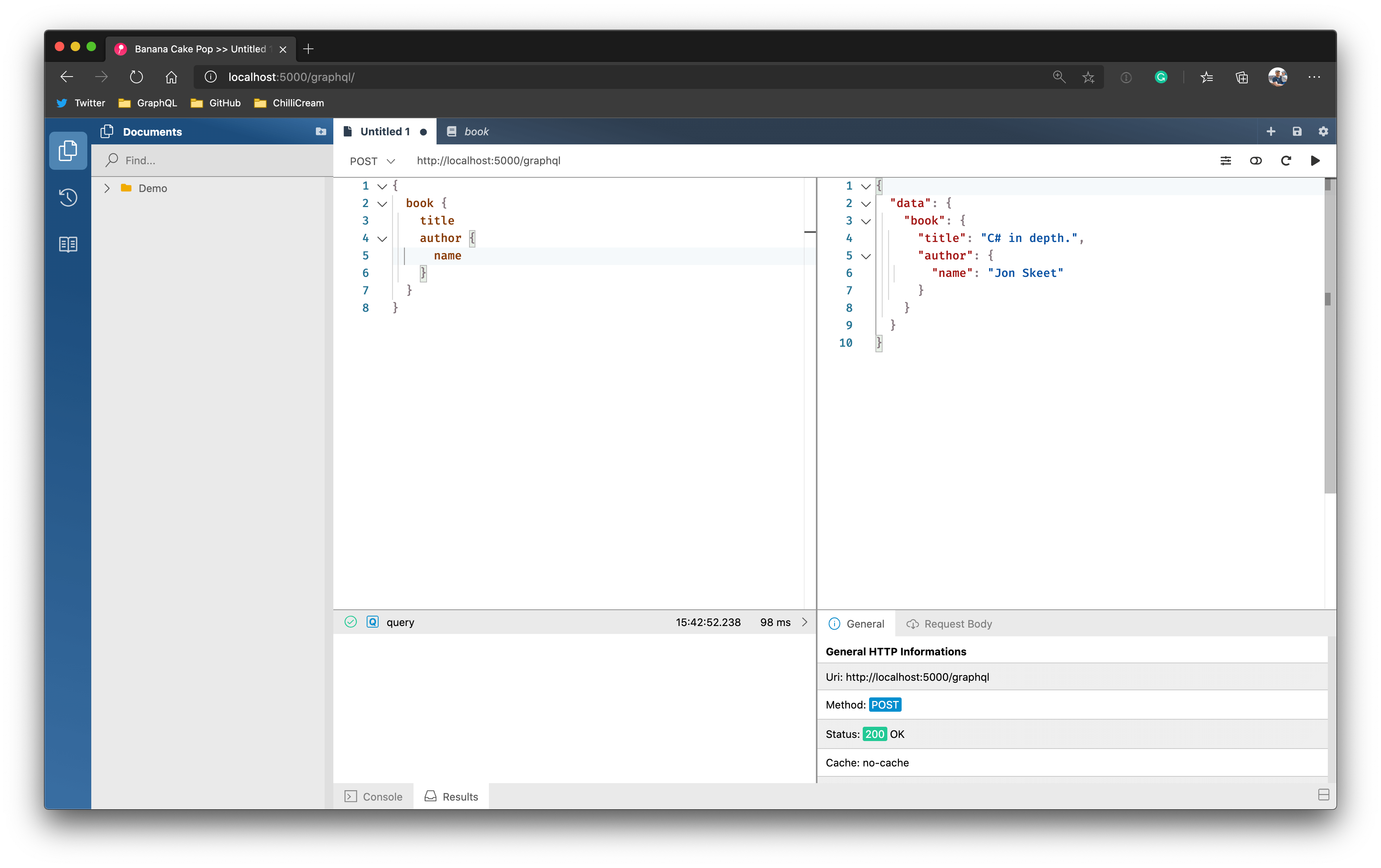 The Hot Chocolate GraphQL server comes right out of the gate with excellent tooling. By default, we are mapping our GraphQL IDE Banana Cake Pop to the GraphQL endpoint. This means you just need to open your browser and navigate to the configured endpoint to send requests to your server, explore your schema, or build-up tests.